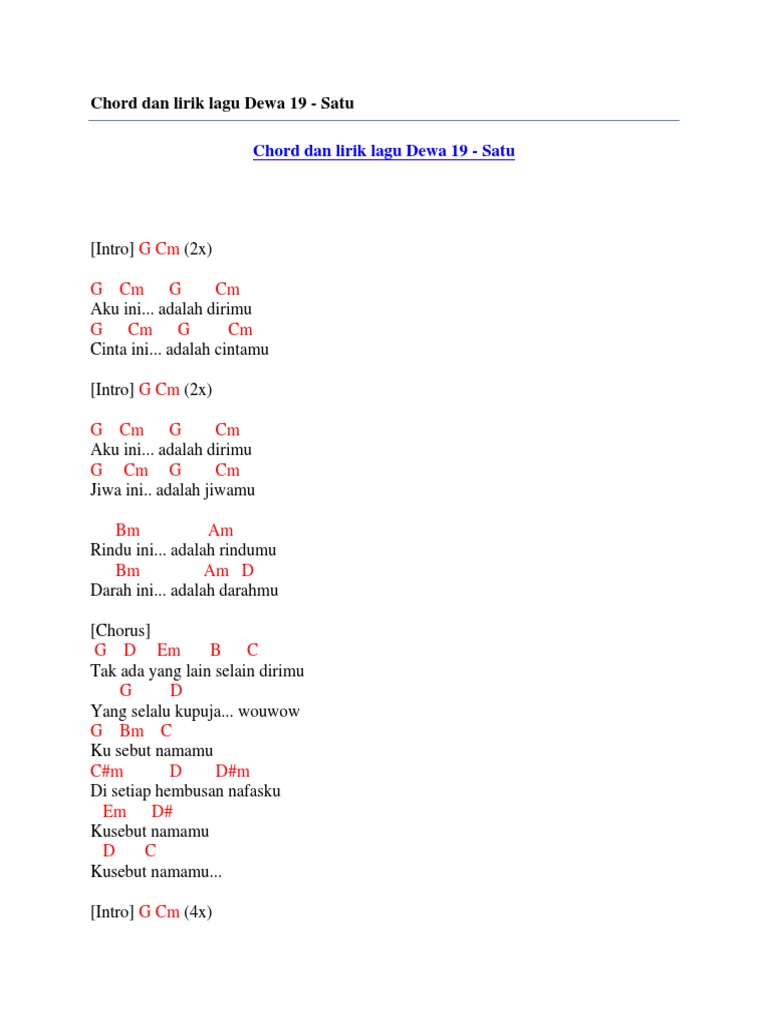 Laras hati Berkelana iris janji Mengukir bisikan Bisikan memacu hasrat Desir-desir mimpi Isyaratkan legit dunia. Lagu ini dirilis pada tahun 1997 dan lirik dan iramanya yang mudah diingat membuatnya menjadi salah satu hits sepanjang masa Dewa. Read Chord dan lirik lagu dewa 19 satu by Chord Zila on Issuu and browse thousands of other publications on our platform.